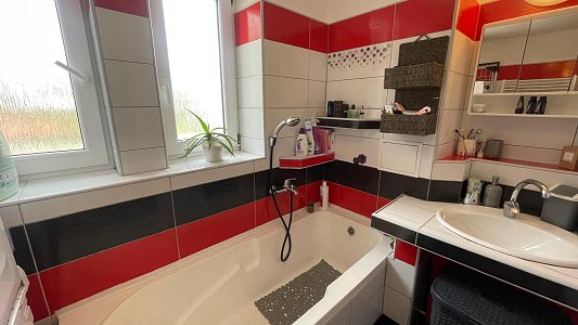 Kúpeľňa s vaňou aj sprchovacím kútom, pripravený priestor na práčku a sušičku